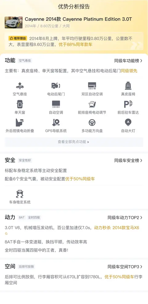 综上所述的新车含税价、用车成本、市场行情、优势分析、同款比价等数据仅供参考。在配置部分,因为二手车非标品,车辆可能会存在配置改装的情况,具体车况信息需要线下结合车辆实际情况进行综合参考。