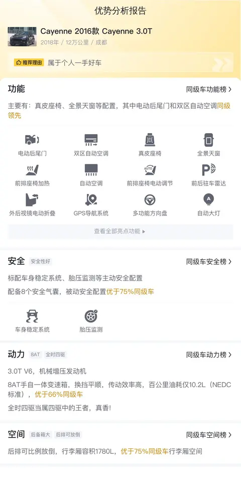 报价占有一定的优势,因为这辆Cayenne 2016款 Cayenne 3.0T的市场行情价是30.72万- 38.07万,它的报价则是32.60万,价格上有优势,同时保值率也高。