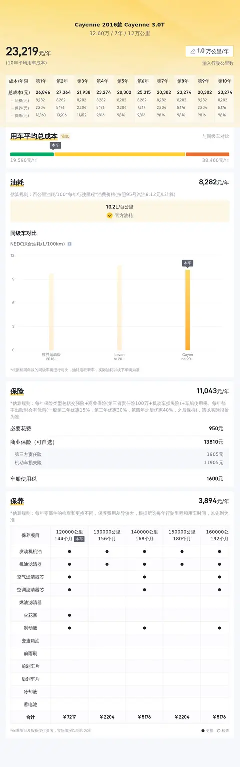 这辆Cayenne 2016款 Cayenne 3.0T的10年平均用车成本是23445元/年,同级车的最低是21464元/年,最高是46796元/年,所以它的算偏低,有一定优势。