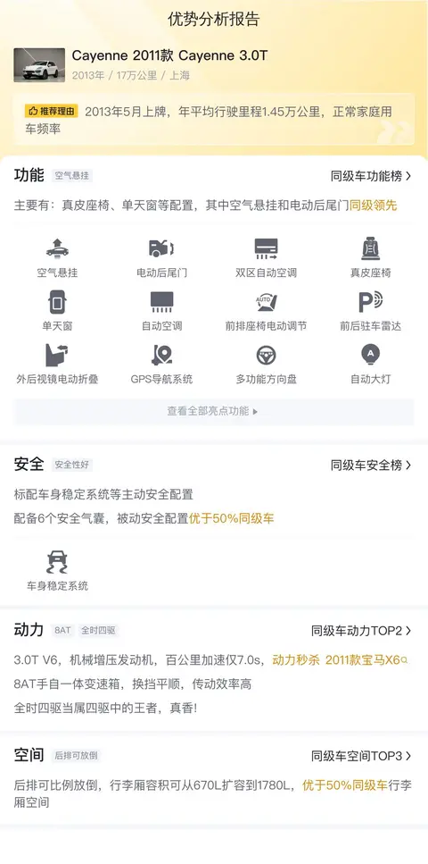 对于配置,我们更关注的是实用性,这辆保时捷Cayenne 2011款 Cayenne 3.0T有哪些实用的配置呢?主要有真皮座椅、单天窗等配置,其中空气悬挂和电动后尾门同级领先。