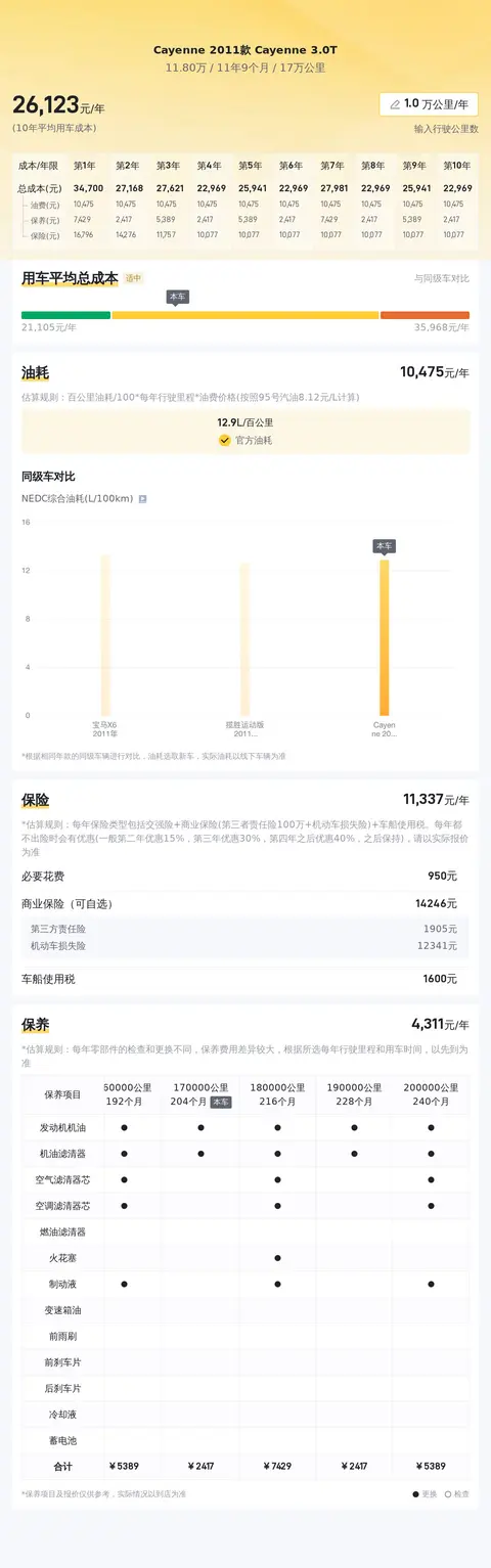 至于用车成本部分,根据我们估算,这辆保时捷Cayenne 2011款 Cayenne 3.0T的10年平均用车成本大概是25680元/年,而同级车的最低10年平均用车成本是19944元/年,最高是46784元/年,所以这辆车的用车成本不算低。