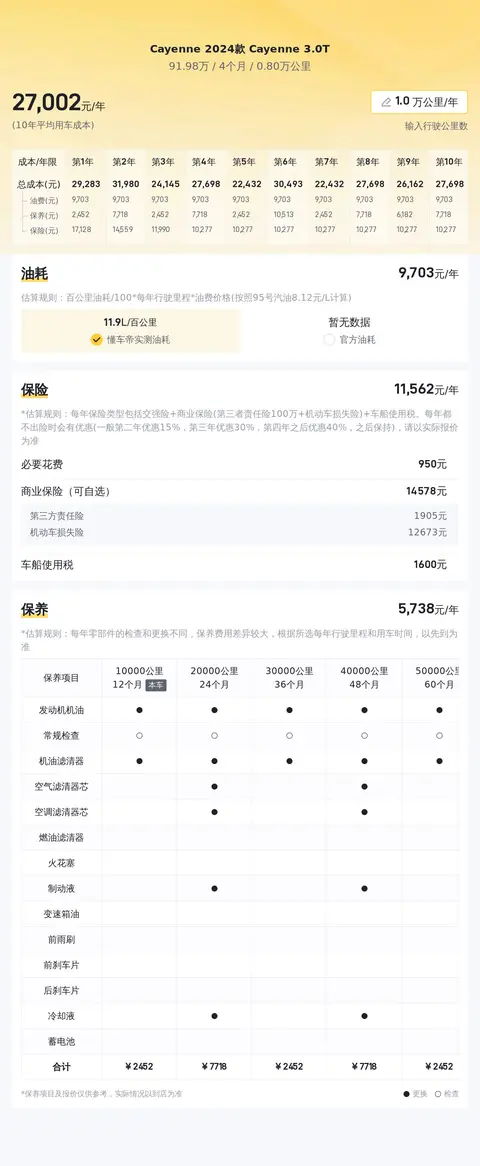 根据懂车帝的估算,这款Cayenne的10年平均用车成本约为2.71万元/年,这一数字与同级别车型相比处于适中的水平。具体的用车成本会根据车主的驾驶习惯、用车环境和车辆维护情况等因素而有所不同。