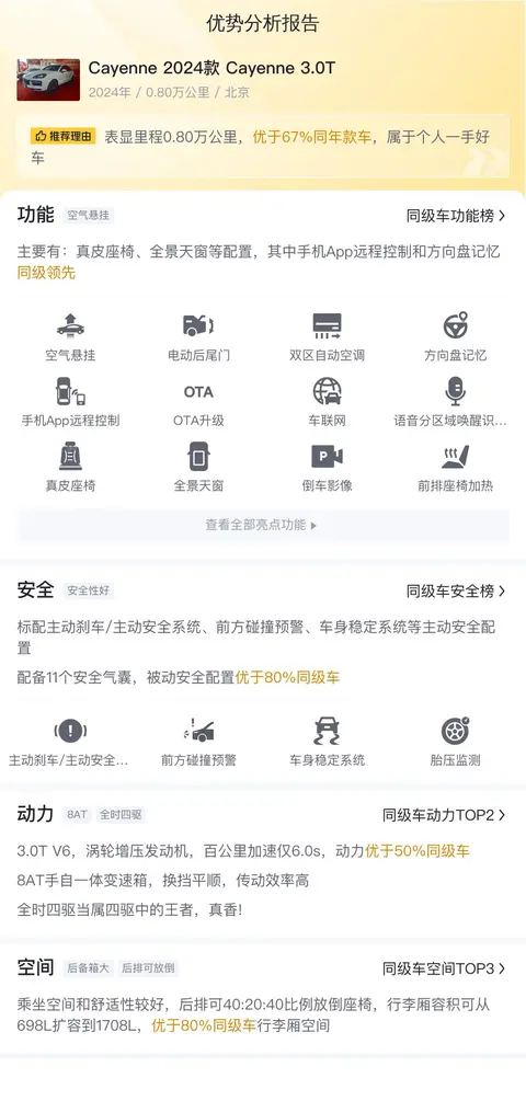 综上所述,这款二手保时捷Cayenne在车况、里程数、车龄和过户次数等方面都表现得相当出色。如果您正在寻找一款性能卓越、外观抢眼且具有较高性价比的豪华SUV,那么它无疑是一个值得考虑的选择。当然,在购买二手车时还需要注意车辆的实际情况和售后服务保障等方面的问题。我们承诺提供真实、准确的信息和专业的服务,帮助您做出明智的决策。祝您购车愉快!