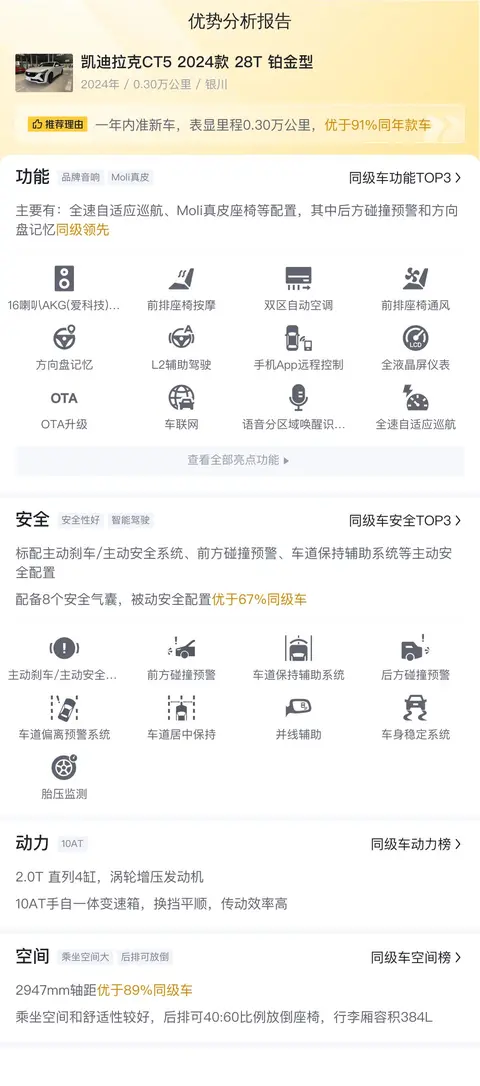 综上所述,这辆凯迪拉克CT5 2024款 28T 铂金型在配置、动力、空间等方面表现出色,尤其是丰富的配置和强劲的动力令人印象深刻。不过,品牌保值率和油耗可能是需要考虑的因素。目前这辆车的二手报价较为合理,考虑到凯迪拉克CT5本身的竞争力,如果对油耗和品牌价值没有特殊顾虑,可以作为购买选项之一。