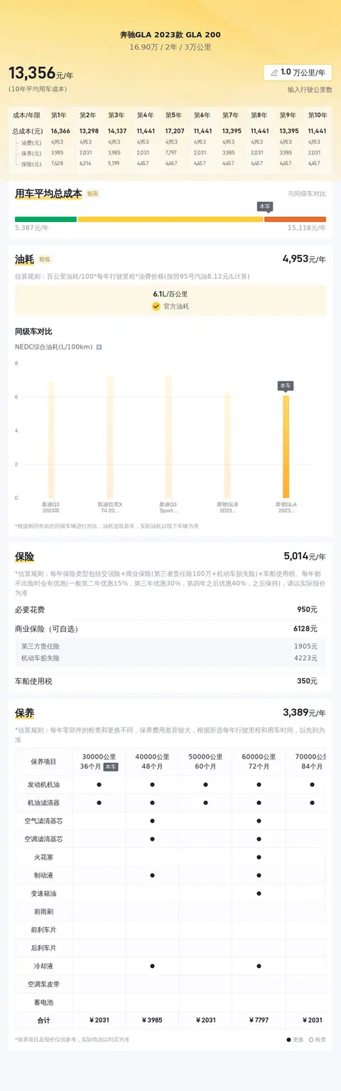 在用车成本方面,该车型的百公里油耗为6.78升。按照每年行驶2万公里计算,燃油费用约为13560元。此外,保险费用每年约为5718元,保养费用每年约为4178元。因此,该车型的年均综合用车成本大约为23465元。然而,受多种因素的影响,实际费用支出可能有所变动,包括驾驶习惯、行驶距离及市场波动等因素。购车者在做出购买决策之前,建议充分考虑这些潜在的成本增加因素。