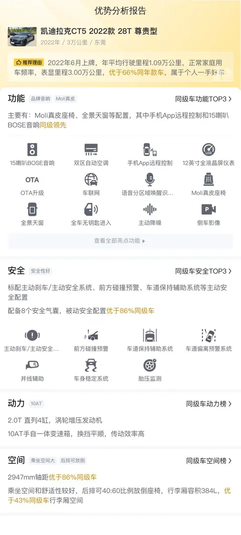 优势分析报告部分,可以看到这辆车在安全、动力、舒适以及空间部分都有那些表现。