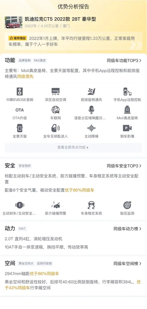 综上所述的新车含税价、用车成本、市场行情、优势分析、同款比价等数据仅供参考。在配置部分,因为二手车非标品,车辆可能会存在配置改装的情况,具体车况信息需要线下结合车辆实际情况进行综合参考。