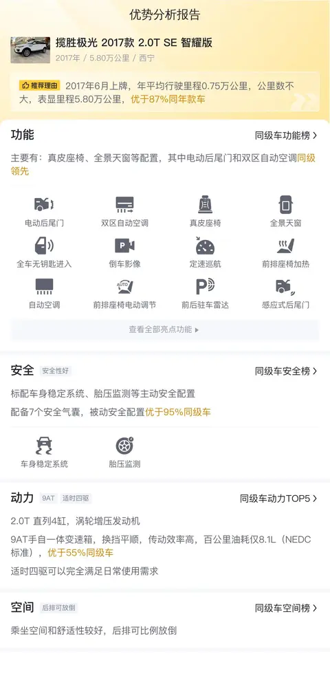 综上所述的新车含税价、用车成本、市场行情、优势分析、同款比价等数据仅供参考。在配置部分,因为二手车非标品,车辆可能会存在配置改装的情况,具体车况信息需要线下结合车辆实际情况进行综合参考。