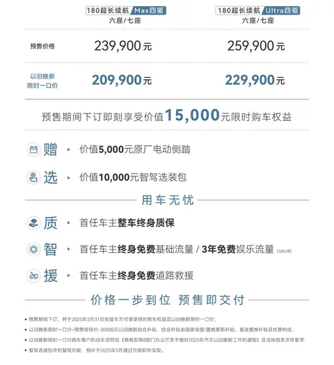 [懂车帝原创 产品] 日前,我们从EXEED星途汽车官方获悉,星途揽月C-DM(图片|配置|询价)将于3月27日上市。该车在今年2月23日开启预售,共推出两款两个版本,分别为180超长续航Max四驱6座/7座、180超长续航Ultra四驱6座/7座,预售价区间为23.99万-25.99万元。预售期间下订,置换类购车可享受以旧换新限时一口价20.99万元起、价值1.5万元限时购车权益、首任车主权益(三种权益可同时享受,用户需于2025年3月31日前提车)。