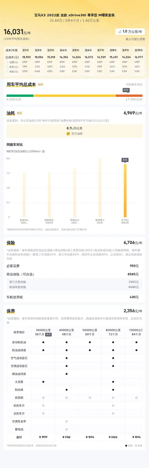 这辆车目前售价31.6万,按照每年行驶2万公里计算,10年平均用车成本约16500元/年,考虑到油耗、保养、保险等因素,这辆车的性价比较高。