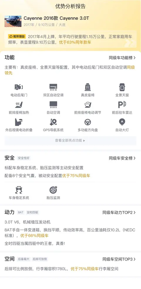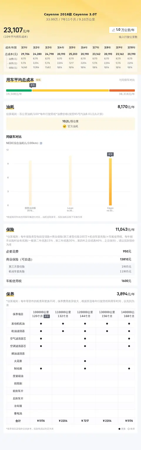 据估算,同级车的最低用车成本是18782元/年,最高是43720元/年,Cayenne 2016款 Cayenne 3.0T是22538元/年,用车成本较低,具有一定优势。