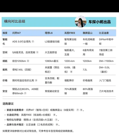 分别从 动力、续航、空间、智能化、安全、能耗、配置、优势 、劣势、亮点等方面