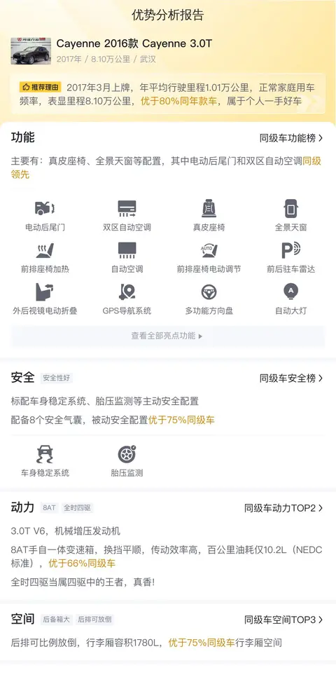 今天我们要介绍的这辆二手保时捷Cayenne,具体版本是——Cayenne 2016款 Cayenne 3.0T,位于武汉,该车是2017年3月上牌的紫色四驱越野车,行驶里程8.1万公里,新车指导价88.8万,现售价28.58万。