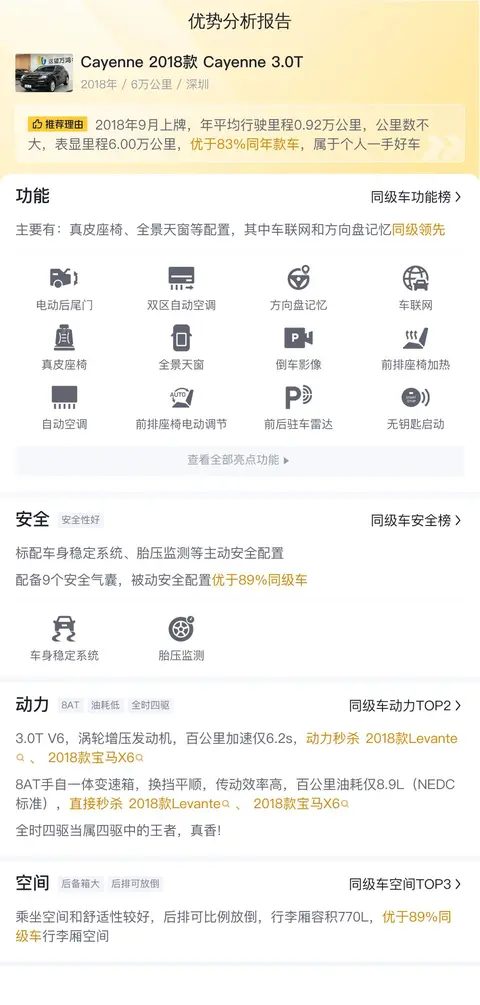 优势:定价比较实惠,保时捷Cayenne 2018款 Cayenne 3.0T的市场行情价是46.27万- 56.45万,而该车的报价是46.8万,价格上有很大优势,同时保值率也高。配置齐全,真皮座椅、全景天窗、车联网和方向盘记忆同级领先。动力强悍,加速快,空间宽敞。