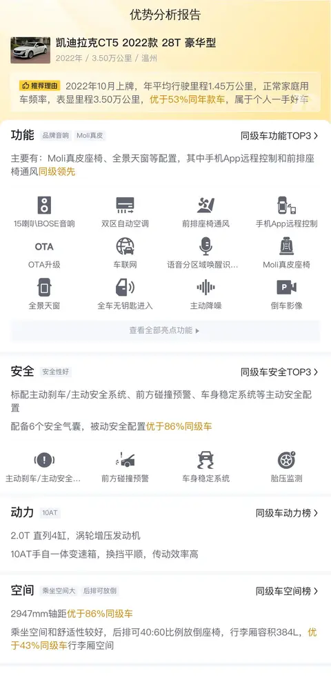综上所述,凯迪拉克CT5 2022款 28T 豪华型在动力性能、车身尺寸、配置丰富性和舒适性等方面均表现出色,是一款集豪华与实用于一身的豪华轿车。其二手车价格因车况而异,当前这款车的车况良好,且价格较为实惠,对于追求驾驶乐趣和豪华体验的消费者来说,无疑是一个不错的选择。