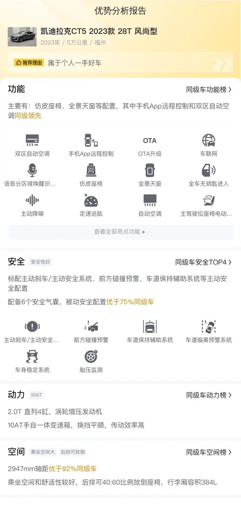 凯迪拉克CT5(图片|配置|询价)是凯迪拉克汽车公司推出的一款豪华中级轿车,作为凯迪拉克豪华后驱轿车阵营的重要车型,凯迪拉克CT5基于凯迪拉克轻量化豪华后驱平台打造,凭借不凡格调与非凡性能,为消费者带来原汁原味的豪华后驱驾控体验。CT5采用了凯迪拉克最新的设计语言,外形动感而富有力量感。今天我们就为您带来一辆二手凯迪拉克CT5。先来看看这辆二手凯迪拉克CT5的基础信息。该车的具体版本是——2023款28T风尚型,2023年8月上牌,跑了5万公里,未过户,目前报价17.3万。