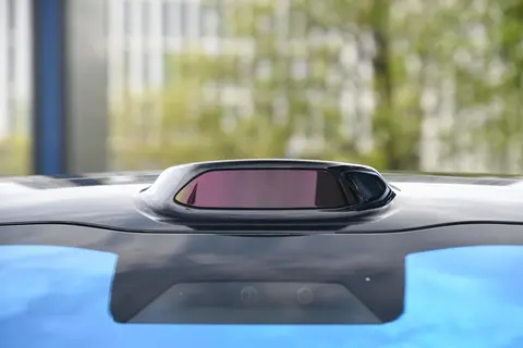 外观方面,这车的设计还挺有未来感的。前格栅非常简洁,两侧还有做了熏黑处理的远近光。让人想起国宝大熊猫。很自信也很有朝气。车顶可以看到一个顶置的激光雷达。不用说,他是一款配置了高阶智驾的车型。
