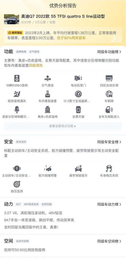 综上所述,这款奥迪Q7 2022款 55 TFSI quattro S line 运动型在车辆状况良好、价格合理的情况下,是一款值得考虑的二手车选择。但需要注意的是,车辆的实际状况和售价需结合具体情况进行评估,建议消费者在购买前进行详细的了解和比较。