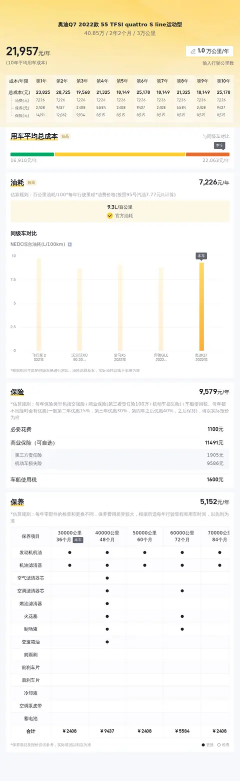 根据大数据分析,目前这款奥迪Q7 2022款 55 TFSI quattro S line 运动型的二手车市场价格区间为36.7万至44.27万元,具体售价因车辆状况而有所不同。在用车成本方面,按照每年行驶2万公里计算,包括保险、保养、燃油等费用在内,平均每年用车成本约为2.1万元。