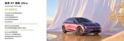 爆款轿跑SUV智界R7推出增程新版本,在华为雪鸮智能增程系统极致静谧与低油耗优势基础上,带来53.4kWh大电池和四驱增程系统,满足用户对更高续航、更强性能的追求。其中,智界R7增程Max CLTC纯电续航达360km,城市纯电使用一周一充;满电满油CLTC综合续航可达1673km,WLTC百公里油耗低至5.68L,行驶里程更长,出行成本更低。智界R7增程Ultra搭载华为DriveONE四驱系统,零百加速仅需4.9秒,配合满血途灵平台拥有82.2km/h麋鹿测试成绩,提供极致操控的爽感和可油可电的便捷。智界R7增程新版本的上市,将进一步强化智界R7在细分市场的竞争力,夯实“油电双强”的车型布局。