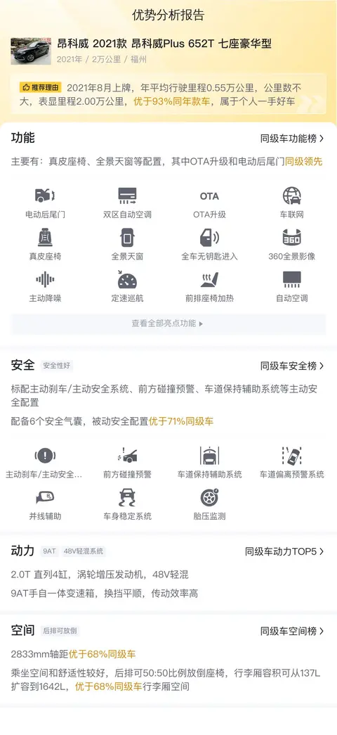 综上所述的新车含税价、用车成本、市场行情、优势分析、同款比价等数据仅供参考。在配置部分,因为二手车非标品,车辆可能会存在配置改装的情况,具体车况信息需要线下结合车辆实际情况进行综合参考。