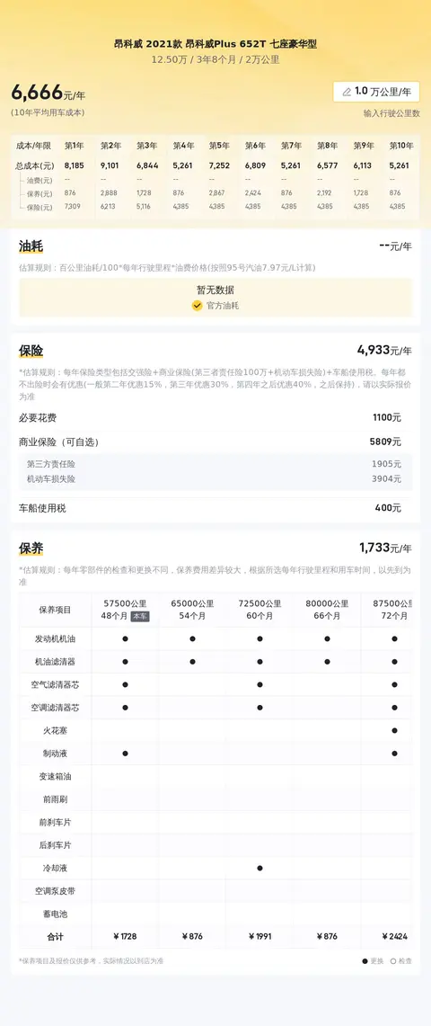 在用车成本方面,我们以每年行驶1万公里计算,10年平均用车成本约6705元/年。具体包括油费约5630元/年、保险约4107元/年、保养约977元/年。需要注意的是,这些费用会根据每个人的使用习惯、环境条件及保险选择等因素有所变化。