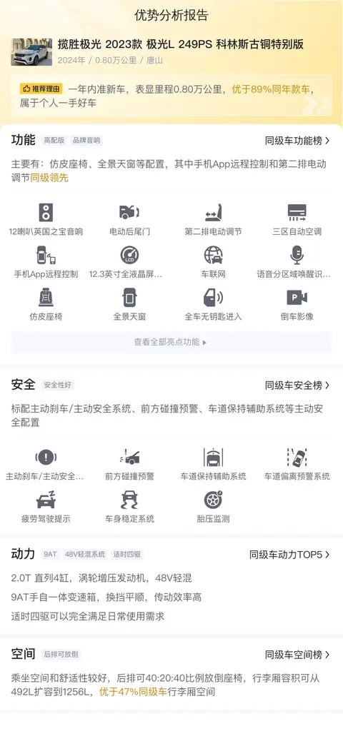 综上所述的新车含税价、用车成本、市场行情、优势分析、同款比价等数据仅供参考。在配置部分,因为二手车非标品,车辆可能会存在配置改装的情况,具体车况信息需要线下结合车辆实际情况进行综合参考。