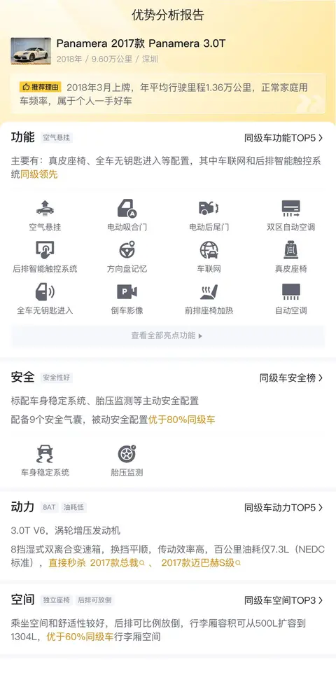 综上所述,这辆二手保时捷Panamera在车况、配置、性能和空间方面表现都不错。需要注意的是,由于车辆没有检测报告,所以具体的车况需要您实地查看。在决定购买之前,建议您仔细检查车辆的实际状况,并考虑自己的预算和需求,做出明智的决策。