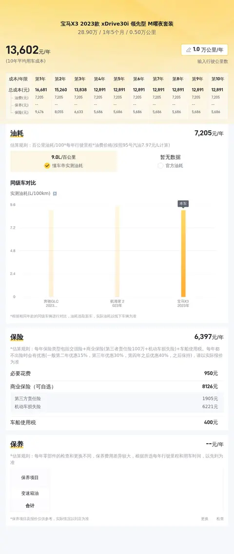 根据懂车帝的估算,这款宝马X3 2023款 xDrive30i 领先型 M曜夜套装的10年平均用车成本约为14187元/年,这一数字与同级别车型相比处于合理区间内。虽然作为一款豪华SUV,宝马X3在燃油消耗和保养费用方面的开支不会很小,但对于追求舒适性和驾驶乐趣的消费者来说,这样的成本支出仍在可接受范围内。