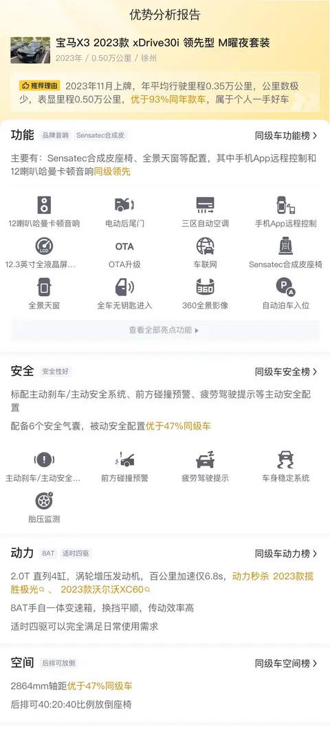 综上所述,这款二手宝马X3 2023款 xDrive30i 领先型 M曜夜套装在配置、动力和空间等方面都有着不错的表现。作为一款豪华SUV,它能为车主提供舒适的驾乘体验和出色的驾驶乐趣。在二手车市场上,这款车的价格相对较为合理,对于追求性价比的消费者来说,它是一个不错的选择。