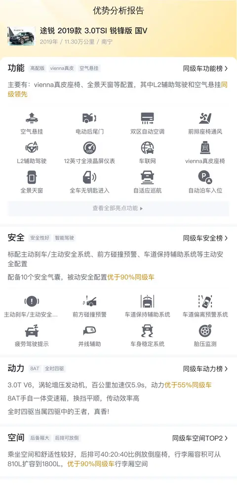 综上所述,这款途锐 2019款 3.0TSI 锐锋版 国V在车况、配置、动力等方面均表现出色。结合懂车帝对该车的综合分析,希望可以帮助到您。