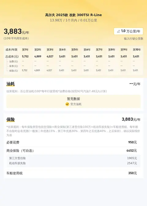 在不考虑其他因素的情况下,按照每年行驶2万公里计算,这款车的百公里油耗为5.5升,每年的油费约为4846元。保险费用方面,每年约需支付3667元的保费。此外,车辆的保养费用每年大约为1177元。综上所述,这款车的年均使用成本约为9690元。这个用车成本相对较为经济合理,对于大多数家庭来说是可以接受的。