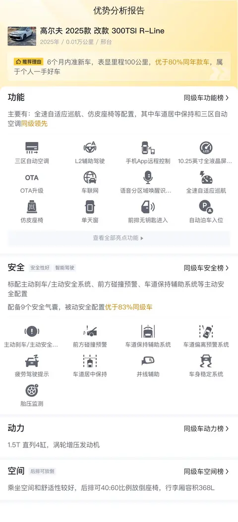 综上所述的新车含税价、用车成本、市场行情、优势分析、同款比价等数据仅供参考。在配置部分,因为二手车非标品,车辆可能会存在配置改装的情况,具体车况信息需要线下结合车辆实际情况进行综合参考。