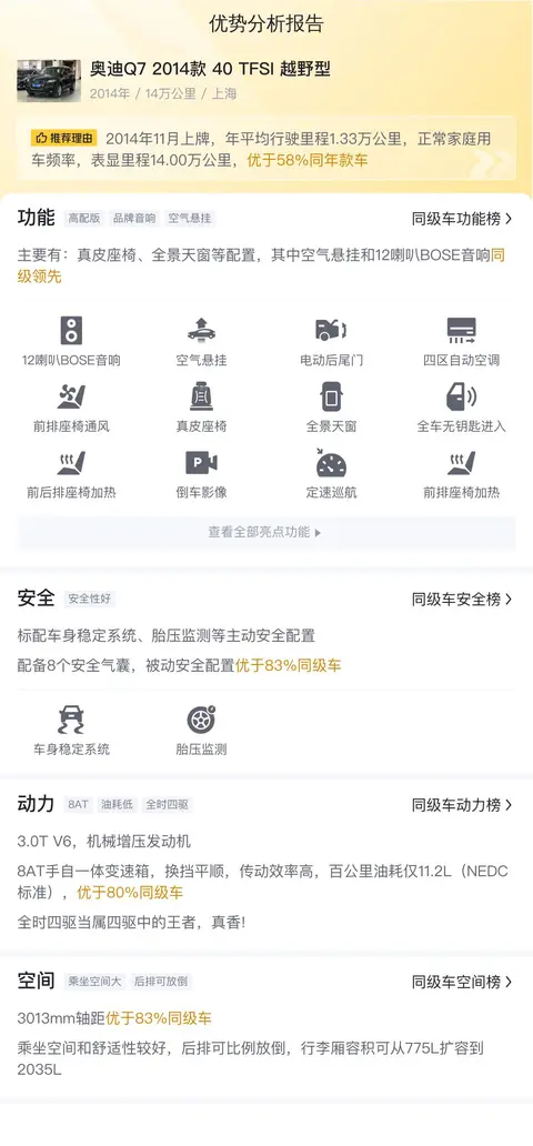 据估算,同级车的最低用车成本是19788元/年,最高是40788元/年,奥迪Q7 2014款 40 TFSI 越野型是29358元/年,用车成本适中。