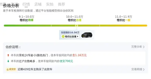 在价格部分,我们为您提供了市场行情参考、用车成本估算以及价格影响因素分析。首先,根据当前市场对类似车型的评估,您的爱车的市场价值区间大致在10.62万元到13.17万元之间。至于用车成本部分,这辆车的10年平均成本大约在每年1.2万元左右(按每年行驶一万公里计算)。最后,关于价格影响因素,主要包括车辆的车龄、里程、过户次数、颜色等。