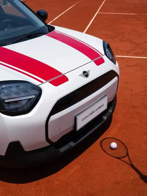 电动MINI ACEMAN新配色均采用黑色车顶,辣椒红配色车型还有黑/白双拼色轮辋。新车整体尺寸轮廓相比电动MINI COOPER略大,车头采用八边形轮廓装饰前脸主要视觉位置,LED头灯组采用见棱见角的多边形轮廓。