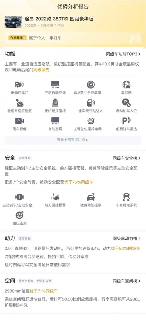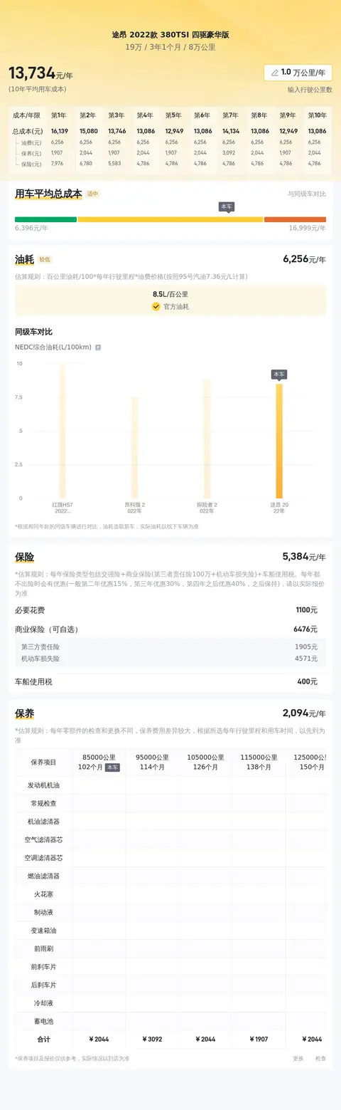 大家是不是觉得这款途昂性价比很高呢?别急,让我们再来看看这款车的用车成本、市场行情、优势分析、同款比价等重要信息,这些都将影响您的购车决策哦~当然,具体的车况信息还需要您线下结合车辆实际情况进行参考。