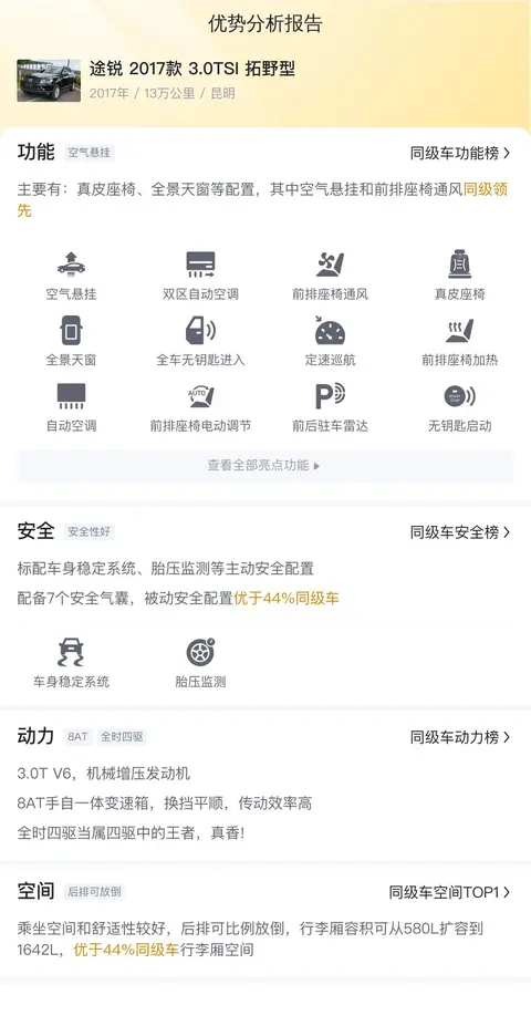 综上所述的新车含税价、用车成本、市场行情、优势分析、同款比价等数据仅供参考。在配置部分,因为二手车非标品,车辆可能会存在配置改装的情况,具体车况信息需要线下结合车辆实际情况进行综合参考。