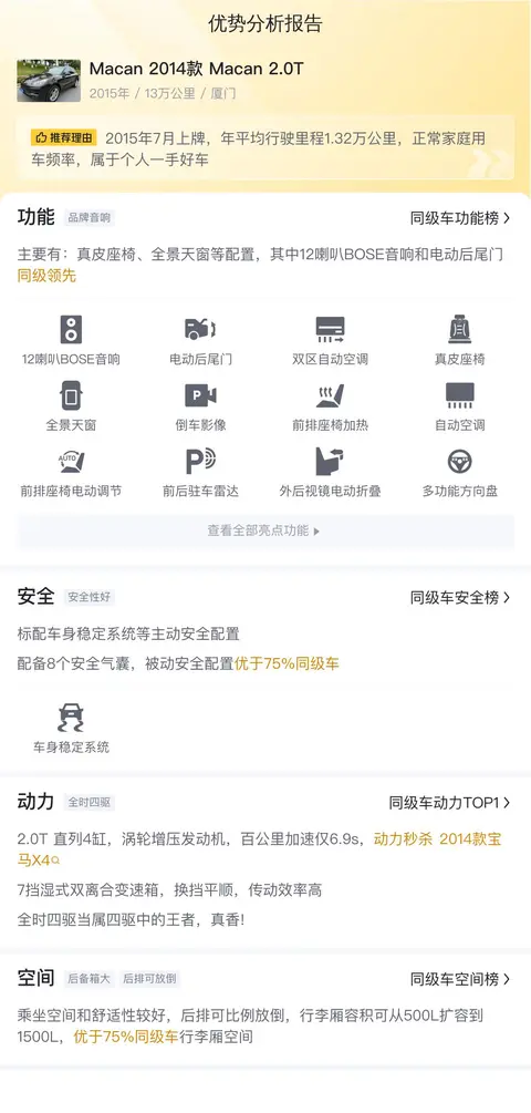 接下来是配置部分,这辆Macan配备了电动后尾门、全景天窗、前排座椅加热和通风等功能,其中电动后尾门和座椅通风在同级别车型中处于领先地位。在安全性方面,车辆配备了多项主动安全技术,如车道偏离警告和前方碰撞预警等,有效提升了驾驶安全性。