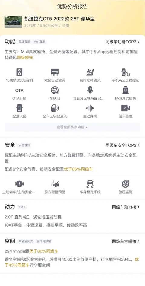 总结:综上所述,这辆凯迪拉克CT5 2022款 28T 豪华型在车况、价格、性能、配置、安全等方面均表现出色。对于想要购买一辆高品质二手车的消费者来说,无疑是一个不错的选择。但需要注意的是,在购买二手车时一定要选择正规的渠道和商家,进行详细的检查和了解,以免出现不必要的纠纷和问题。