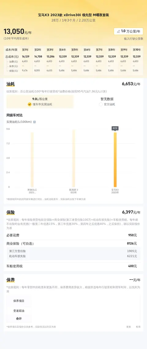在用车成本方面,经测算,这辆车的年均综合用车成本约1.3万元左右,具体费用根据车主的实际使用情况而有所不同。