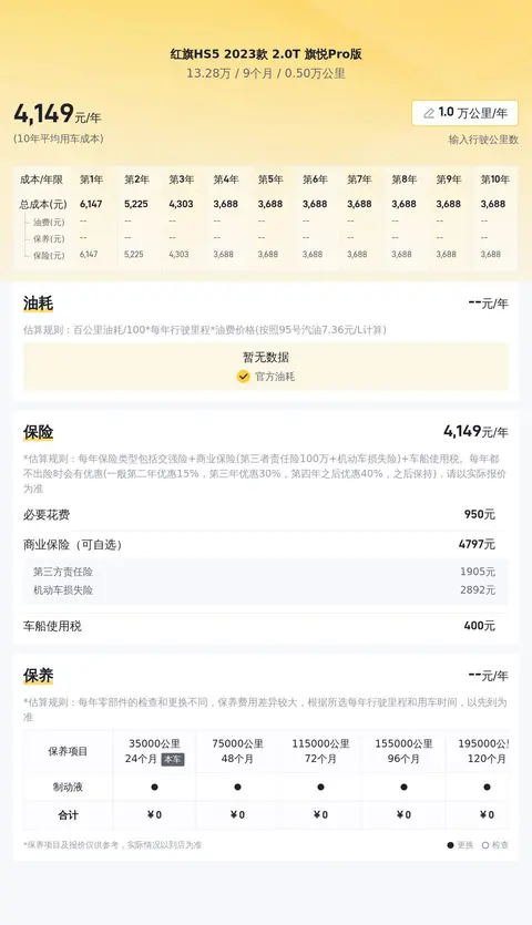 作为一款家用中型SUV,红旗HS5的用车成本也是大家比较关心的点。我们估算了一下,这辆车的10年平均用车成本约为每年1.2万元左右,当然具体用车成本金额还是根据车辆的实际使用情况而决定的。