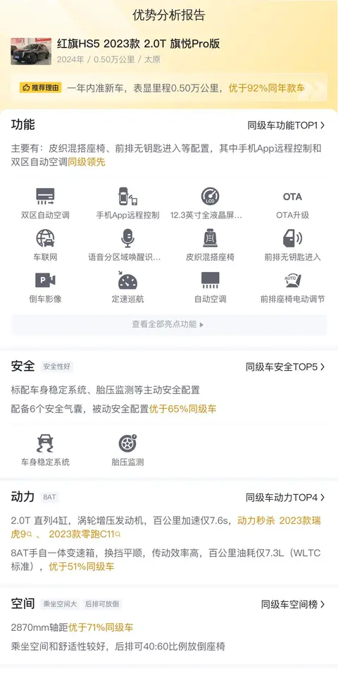 值得一提的是,这辆车自上牌以来行驶里程仅为0.5万公里,基本属于准新车,而且价格相较于新车指导价优惠了不少,对于想要购买红旗HS5但预算有限的朋友来说,无疑是一个不错的选择。