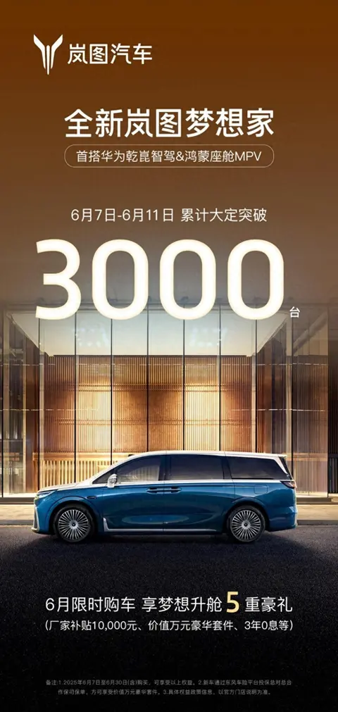 最近听说岚图出新政策了,买了这车能省5万5。6月9号到15号短短五天,他们家订单就冲到了3000多,看起来是要当周销量冠军了。我平时路过4S店也见过这车,白色车身还挺大气,没想到现在这么多人抢。
