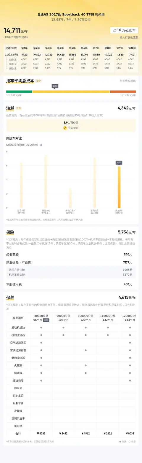 此外,根据估算,同级车的最低10年平均用车成本是14873元/年,最高是17777元/年,而这辆奥迪A5 2017款 Sportback 40 TFSI 时尚型是15438元/年,所以用车成本适中。