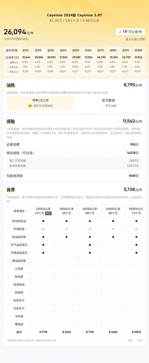 用车成本方面,这辆车的官方百公里油耗为11.4L,按照每年行驶一万公里计算,燃油费用约为9632元,年度商业保险约11888元,每年保养费用约4668元,平均年度用车总成本约26188元,具体费用根据用车实际情况而定。
