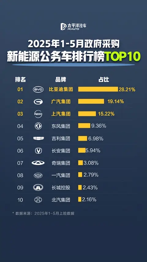 近日,太平洋汽车发布2023-2025年政府采购新能源公务车榜单。数据显示,比亚迪连续2年成为政府采购新能源公务车冠军,今年1-5月仍旧保持大幅领先。