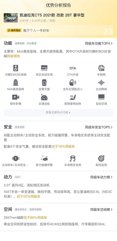 在舒适配置方面,该车拥有Moli真皮座椅、全景天窗等配置,其中OTA升级和15喇叭BOSE音响同级领先。在智能驾驶方面,该车虽然未达到L2级辅助驾驶标准,但配备了多项驾驶辅助系统,如定速巡航、倒车影像等,提升了驾驶的便捷性和安全性。在空间方面,2947mm轴距优于89%同级车,乘坐空间和舒适性较好,后排可40:60比例放倒座椅,行李厢容积384L,优于56%同级车行李厢空间。