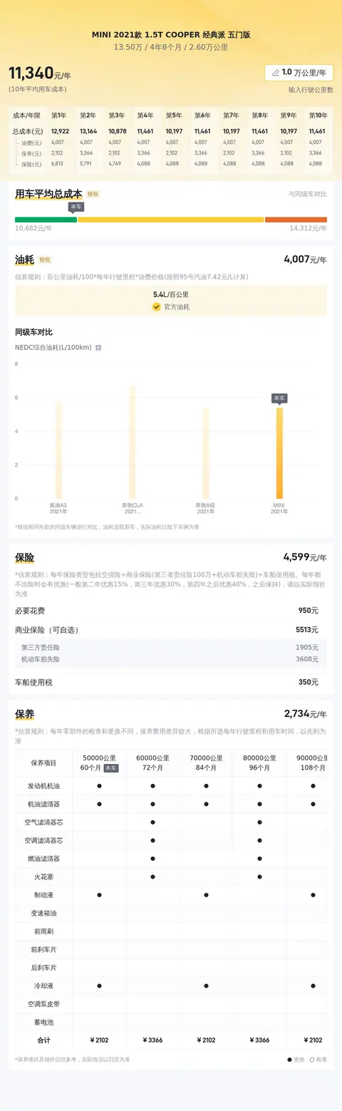 同时,同级车的最低10年平均用车成本是10338元/年,最高是13726元/年,而这辆二手MINI 2021款 1.5T COOPER 经典派 五门版是11377元/年,处于适中的水准。