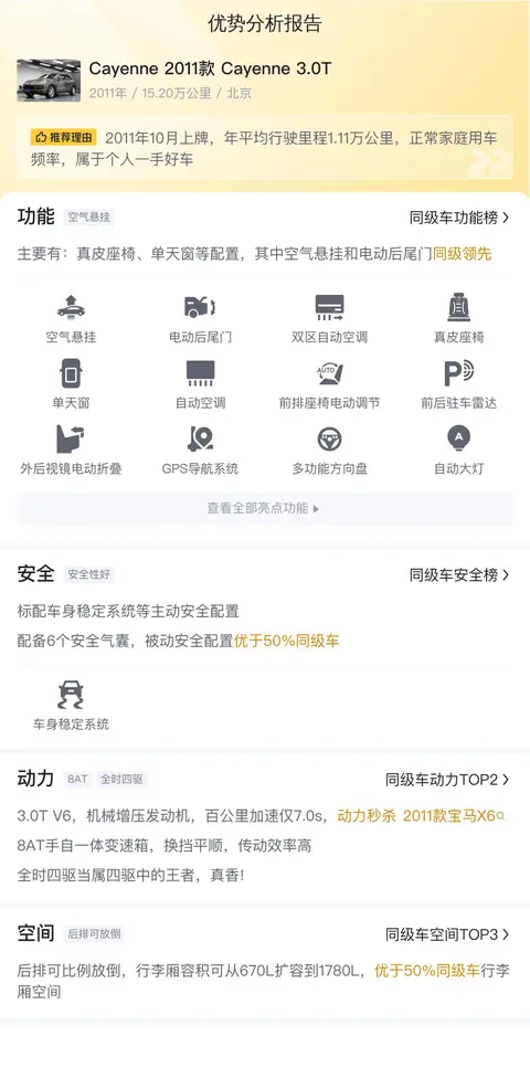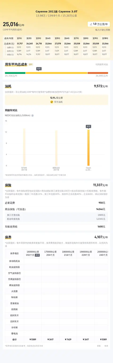 据估算,Cayenne 2011款 Cayenne 3.0T的用车成本较低,因为它的用车成本是25138元/年,同级车最低是21278元/年,最高是46700元/年。